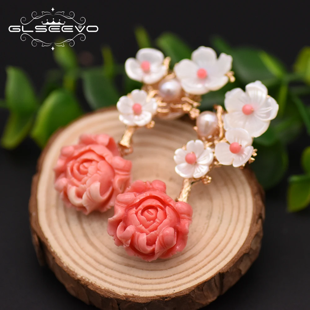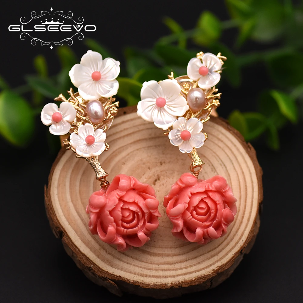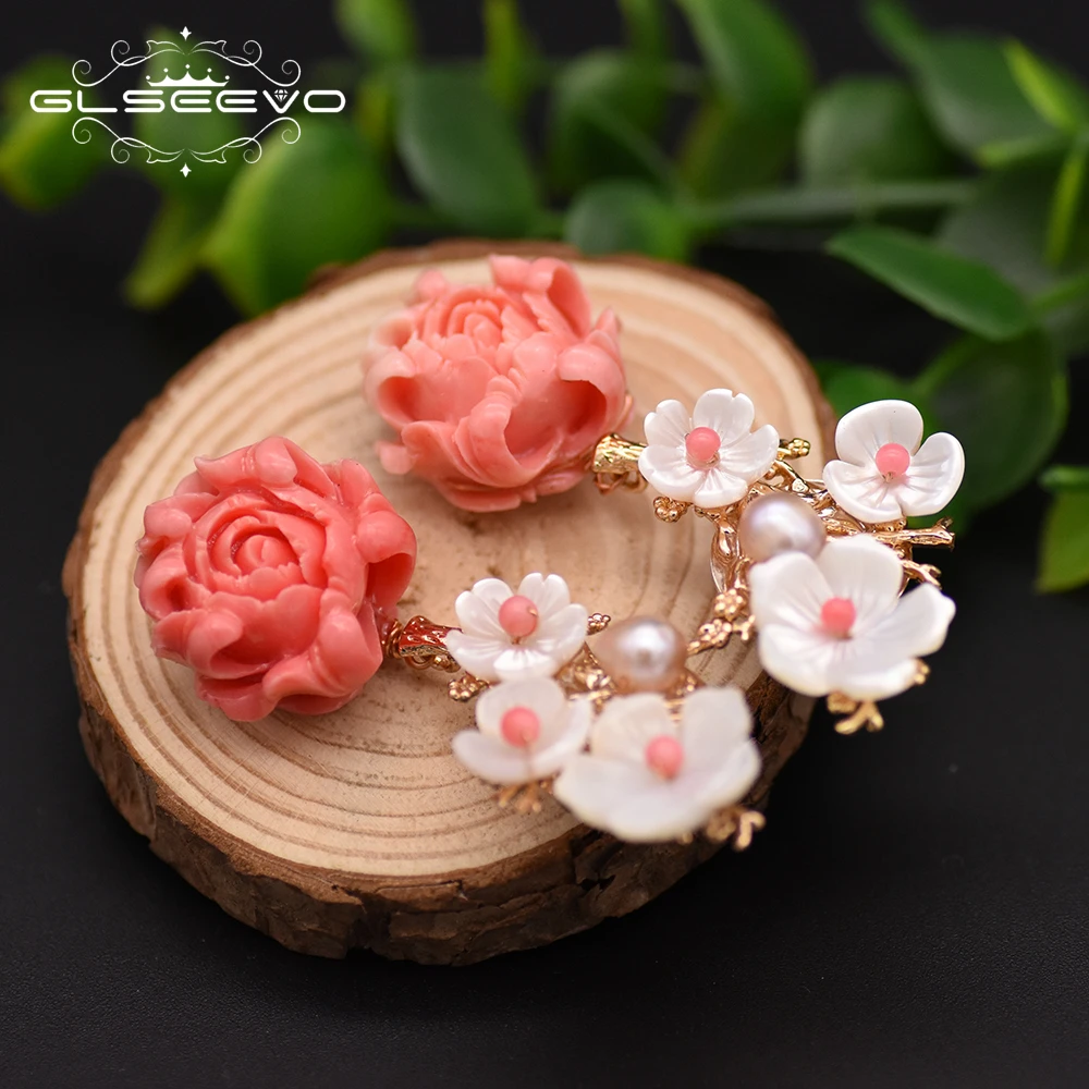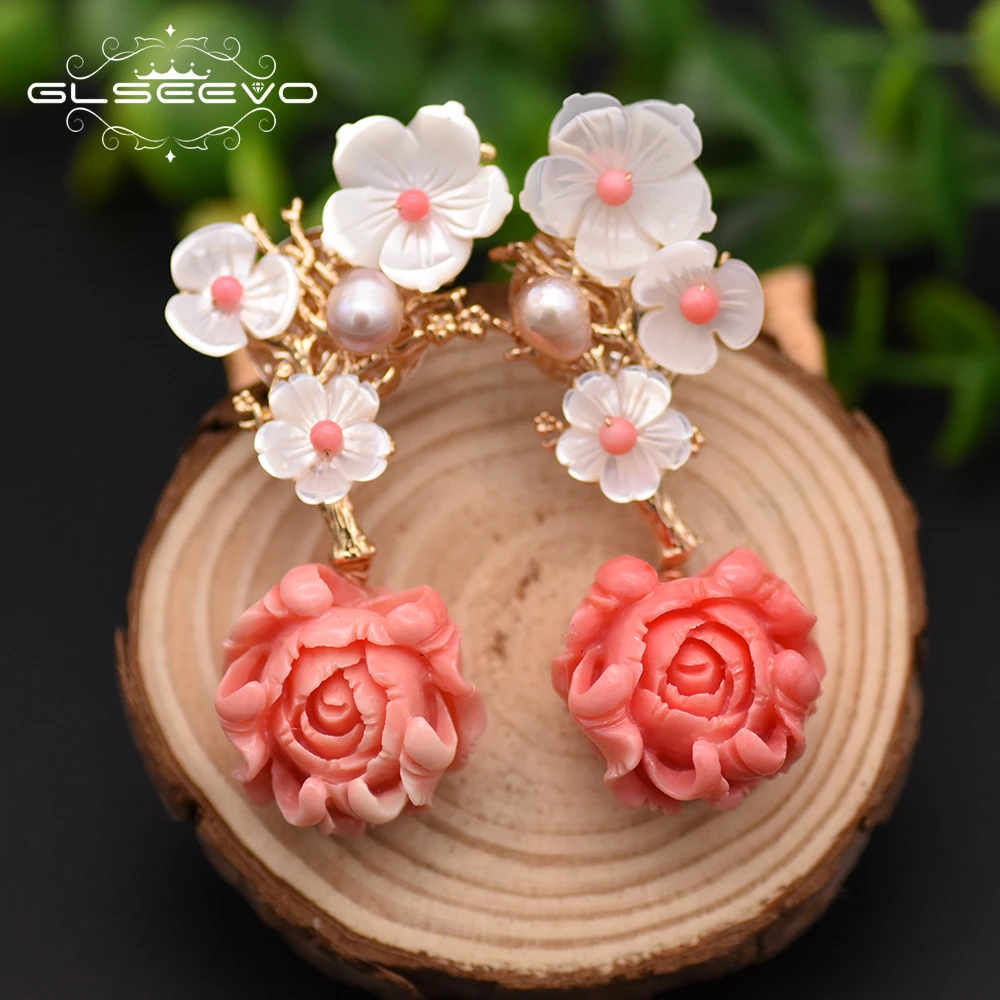Discount GLSEEVO 925 Sterling Silver Pink Coral Drop Earrings White Pearl Pink Natural Stone Shell Flower Dangle Earrings Jewelry GE0024